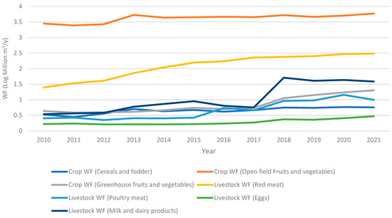 The agricultural WF comprises the crop and livestock WF. The annual average of the total agricultural WF was 50 million m3/y in Qatar from 2010 to 2021. Crop WF accounted for the majority of this WF; open field fruits and vegetables accounted for the highest WF followed by red meat and milk and dairy products with an annual average WF of 37, 8, and 2 million m3/y, respectively. Figure 2 shows the trends of agricultural WF categories from 2010 to 2021. A steady increase is observed for the most part; however, in 2018 a sharp increase was observed for some categories, mainly for milk and dairy products, which went from an annual average WF of 1 to 4.5 million m3/y. This corresponds to the blockade imposed on Qatar by neighboring countries in 2017, which drove Qatar to rely on local production rather than imports to cover its needs.