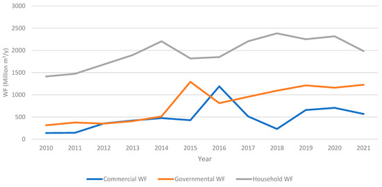 Water footprint (WF) trends in the urban sector of Qatar from 2010 to 2021, encompassing the commercial, governmental, and household sector WFs.
