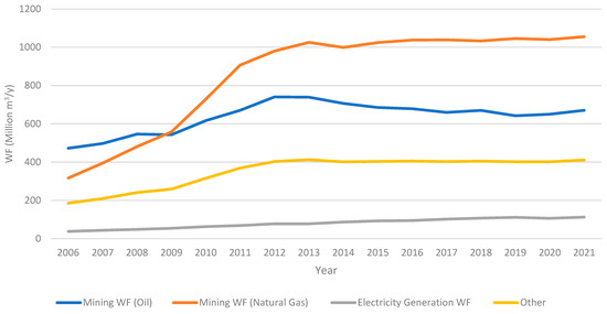 The industrial sector comprises mining and quarrying WF—which includes oil, natural gas, and other mining activities, the electricity generation WF and the WF of other industrial activities. The annual average of the total industrial WF was 1650 million m3/y in Qatar from 2010 to 2021. Mining and quarrying displayed the highest WF with an annual average of 2160 million m3/y, of which natural gas made up the majority, followed by oil with an annual WF average of 993 and 677 million m3/y, respectively. Figure 4 shows the trend in the industrial WF in Qatar from 2006 to 2021. It is evident that the industrial WF remained stable through the years and steadily increased across all activities except for the oil WF, which reduced marginally in the past decade. Natural gas WF showed exponential growth until 2012; after that, it continued to steadily grow.