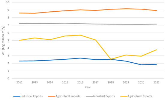The annual average WF for imports stands at 7530 million m3/y, substantially higher than the annual average WF for exports, which is 1450 million m3/y. Despite the agricultural sector’s lower contribution to total imports, its WF is notably higher than that of the industrial sector. The annual average WF for agricultural imports is 7520 million m3/y, whereas for industrial imports, it is 11 million m3/y. Conversely, industrial exports have a much higher WF compared to agricultural exports, with annual average WF figures of 1310 million m3/y and 13 million m3/y, respectively.