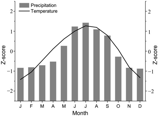 The study area is characterized by a continental arid climate, primarily influenced by the Westerlies and Asian Monsoon. Sixteen meteorological stations were selected around the five sampling sites (Figure 1). The multi-year average climatic pattern in the mean monthly temperature and monthly precipitation is similar among these stations, with a common rainy season during the period from June to September (Figure 2). Meteorological data of 10 stations (ZD, NQ, QML, YS, SQ, QSH, DR, MD, XH, and HN), which were nearby the sampling sites selected to compose the regional chronology and covering a common period (1961–2008) as long as possible, were standardized and averaged to illustrate the general climatic characteristics in the study area (Figure 2). Palmer Drought Severity Index (PDSI) data spanning the instrumental period (1955–2005) were extracted from a globally gridded PDSI database [32] for the four relevant grid points (Figure 1). PDSI data for the four grids (35°–37.5° N, 100°–102.5° E and 32.5°–35° N, 95°–102.5° E) were standardized and averaged to represent the regional moisture conditions.