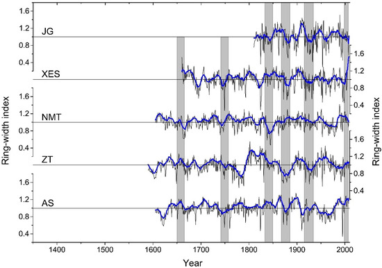 Tree-ring width chronologies of Juniperus przewalskii Kom. for each site in the northeastern Qinghai-Tibetan Plateau. The superimposed blue line is the 11-year running average. All series were truncated with the threshold of 0.85 in EPS.
