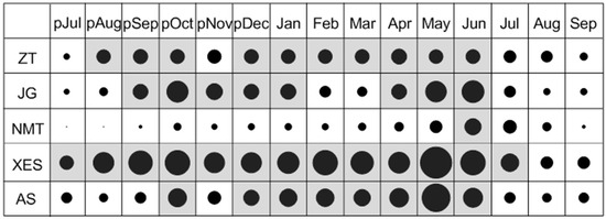 Correlation analysis between the chronology of each site and monthly PDSI of the neighboring grid point for the period 1955–2005. The size of the solid circle represents the magnitude of positive correlation coefficient. The shaded area indicates significance at p < 0.05 level, and “pJul” means July in the previous year.
