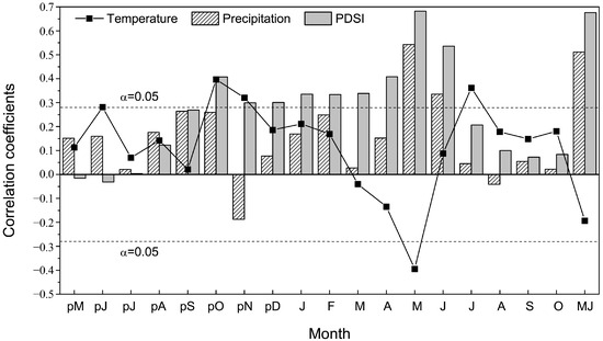 Correlation coefficients between the regional chronology and climate records (temperature and precipitation averaged from a composite of 10 nearby meteorological stations, and PDSI data averaged from the four relevant grid points) from previous May to current October over the period 1961–2008 (time span 1955–2005 for PDSI). The horizontal dashed lines denote the 95% significance levels; “pM” means May in the previous year; “MJ” means May to June.