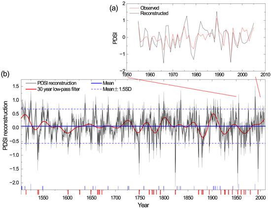 A transfer function was developed by the linear regression model, using May–June PDSI as the dependent variable and the regional tree-ring width chronology as the independent variable. As shown in Table 4, the transfer function, which took the form PDSIM-J = 3.631× RC − 3.521, accounted for 45.7% of the instrumental PDSI variance in May–June over the calibration period (1955–2005). Variation in the reconstructed spring PDSI agreed well with that of the observed series (Figure 7a). Model residuals were reasonably normally distributed and showed low autocorrelation (AR(1) = 0.127, with a non-significant Durbin–Watson statistic). The leave-one-out cross-validation confirmed the good performance of the transfer function (Table 4). The positive value of RE (0.393) indicated the reliability of the derived reconstruction. The results of the ‘sign’ test and product mean test exceeded the 99% confidence level, additionally demonstrating the validity of our regression model [33,34]. Therefore, this model was deemed acceptable and applied to the full chronology.