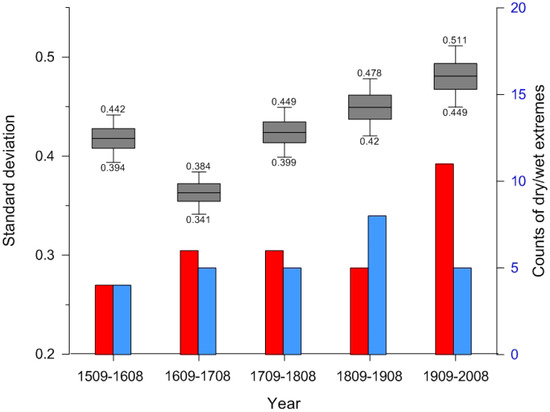 The frequency of extreme single year events was examined for the past five centuries. Years in which the reconstructed PDSI exceeded ±1.5 standard deviation (SD) were defined as extreme single-year events. The top five severely extreme years were identified in 1953, 1824, 1995, 1749, and 1539 for droughts and in 1989, 1835, 1525, 1800, and 1955 for wetness, respectively, most of which arose in the nineteenth and twentieth centuries. The occurrence of dry extremes became significantly frequent during the last century (11 events in total) relative to the previous four centuries (Figure 8). Standard deviation of the reconstructed PDSI in a 100-year window showed that the last century had apparent high values of standard deviation.