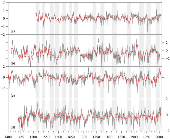 Spring (May–June) PDSI was reconstructed for the period 1505–2008 AD by applying the regional tree-ring chronology to the transfer function (Figure 7b). The reconstructed PDSI exhibited considerable variations on decadal to multi-decadal timescales, as shown by the 30-year low-pass filter curve. As shown by the 30-year low-pass filter curve, relatively dry periods (below the mean for more than 15 years in succession) occurred during 1582–1631, 1737–1757, 1772–1791, 1869–1891, 1916–1939 and 1952–1982. In contrast, relatively wet intervals (above the mean for more than 15 years in succession) were observed in 1505–1527, 1543–1564, 1712–1736, 1792–1816, 1852–1868, 1892–1915, and 1983–2008.
