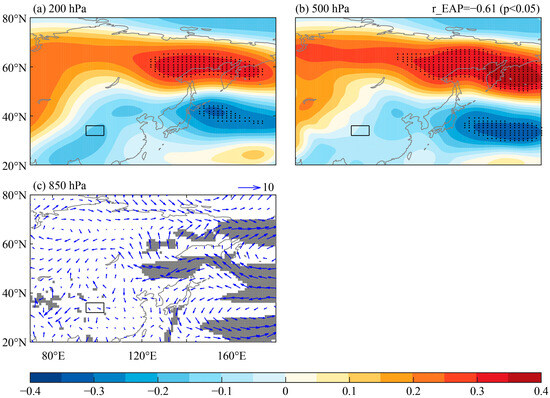 Spatial regression patterns between reconstructed mean May–June PDSI and geopotential height anomalies at pressure levels of 200 hPa (a), 500 hPa (b), and wind anomalies at the 850 hPa pressure level (c) during the period of 1955–2008. (The correlation coefficients of reconstructed mean May–June PDSI and EAP teleconnection index are shown in the upper right corner of (b); the black rectangle indicates the location of the sampling sites; the black dots and gray shades indicate passing the 0.05 confidence level).