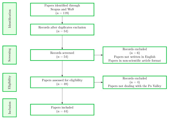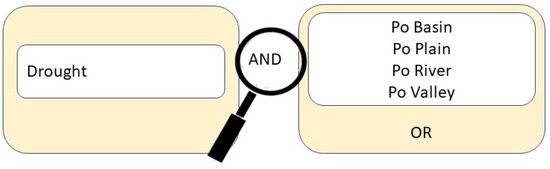 The initial step of this analysis is the identification of the pertinent scientific literature published from 2000 to February 2024 on the topic of drought in the Po Valley. The literature research was performed through the use of the online collections of Scopus (https://www.scopus.com/, accessed on 28 February 2024) and Web of Science (https://www.webofscience.com/, accessed on 28 February 2024). The two databases have been selected since they are the most renowned online databases for scientific literature investigation and are widely recognized for their reliability, completeness and multidisciplinary content.