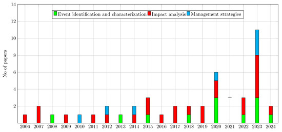 The 44 papers have been divided into three groups according to their aim. The first group includes the papers focusing on event identification and characterization; the second covers articles describing the impacts of the drought events and the third those works dealing with drought management strategies. The major part of the analyzed papers evaluates the impacts of one or multiple drought events (twenty-five studies, representing 58% of the sampled papers), twelve papers deal with drought event identification and characterization, while only seven articles deepen drought management strategies (Figure 4). In the following sections, the three groups are investigated in detail.
