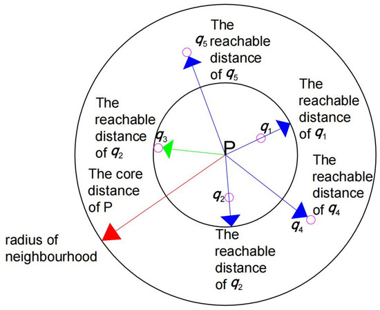 As shown in Figure 1, we assume that the initial parameter sets the minimum number of points in the neighborhood radius to three. At point P, if the count of neighboring points within the neighborhood radius exceeds three, then point P is marked as the core point and its core distance is the third closest point to it . The distance between this point and point P is = . The distance from P is less than , , and . The reachable distance is the core distance P; that is, = , and the distance from P is greater than of and The reachable distance is the distance between them and P; that is, = .