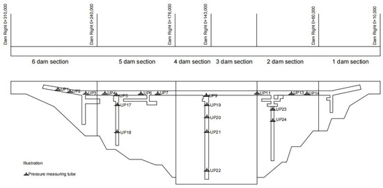 The long-term health and service of concrete dams is important for the safety of water control and is an important public safety issue related to economic life and social stability [1,2,3]. With the continuous construction of concrete dam projects, the geological conditions of dam site areas have become increasingly complex. To prevent engineering accidents caused by structural damage, it is necessary to adopt an appropriate dam safety monitoring strategy [4]. In monitoring concrete dams for safety, the seepage safety of dam foundations is an important issue. According to statistics [5], a large proportion of concrete dam failures are caused by dam foundation seepage problems. The Bouzey gravity dam in France [6], the Austin gravity dam in the United States, and the Malpasset dam in France were affected by dam break accidents caused by seepage in the dam foundation. In dam seepage monitoring, commonly employed mathematical models include statistical models, hybrid models, fuzzy mathematical models, and time series models [7]. These models are single-point monitoring models. When the number of measuring points is large, the possibility of false alarms greatly increases [8], and the spatial distribution information of the monitored quantities is not considered.