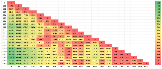 - Spatial clustering results for different distance matrices using the clustering index silhouette coefficient and variance ratio criterion and the results with the silhouette coefficient closest to one and the largest Calinski–Harabasz index were selected. This result was the optimal clustering result. The uplift pressure measuring points with similar heights were utilized to create panel data.