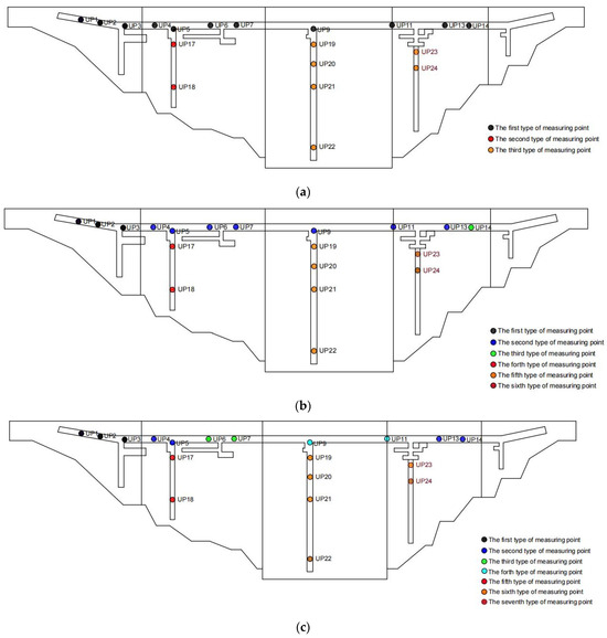 OPTICS clustering results for the uplift pressure measuring points on the dam foundation. (a) Based on the cosine similarity; (b) based on the bilateral slope distance; (c) based on the DTW distance.