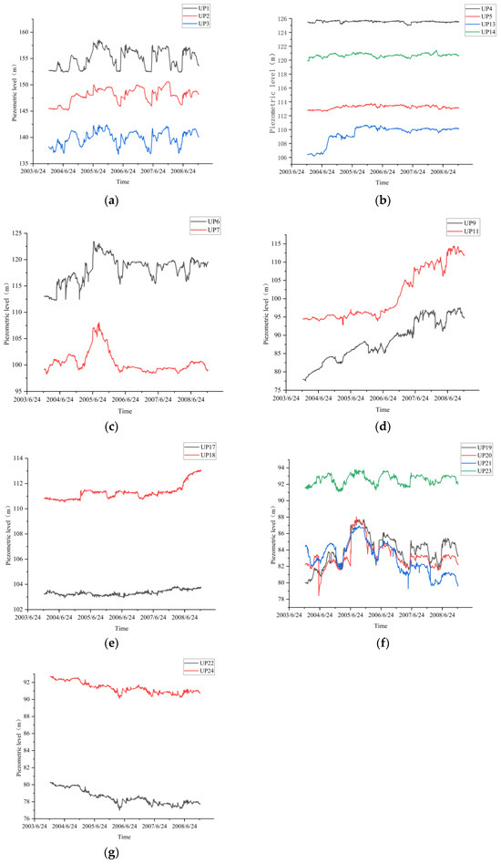Changes in the water level at the seven measuring points. (a) Category I; (b) category II; (c) category III; (d) category IV; (e) category V; (f) category VI; (g) category VII.