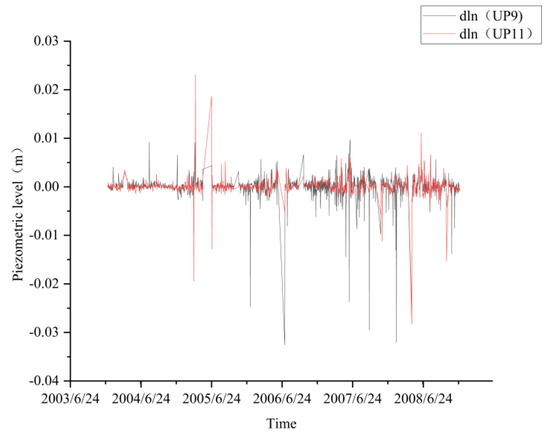 For non-stationary panel data, the model estimation results may be biased. Therefore, before constructing the model, the unit root test should be performed on the panel data. Using the fourth type of measurement point as a reference, the data show a significant growth trend; at this time, it is a nonstationary time series. The processing method in the present study involves using the logarithmic difference in the variables, as shown in Figure 8, to convert the data into a stationary time series and then perform a stationarity test. In this study, the LLC, IPS, and ADF-Fisher tests are employed to examine the unit root of the panel data concerning uplift pressure. The specific test results are listed in Table 3. It can be seen from Table 3 that the p values are all less than 0.1, rejecting the null hypothesis of ‘nonstationary panel data’, so the panel data is stationary.