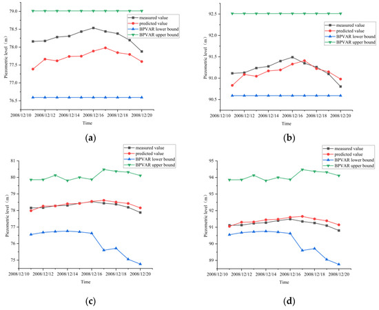 The prediction results of the UP22 and UP24 models with and without the addition of exogenous variables are shown in Figure 10. Each measuring point in the test set was represented by 10 data samples. The prediction error, calculated as the difference between the predicted and actual values, was evaluated for each sample in the test dataset of the model with the addition of exogenous variables roughly fluctuated at approximately 0.1 m, indicating that the prediction accuracy of the BPVAR model improved after the addition of exogenous variables.