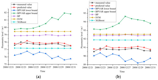 In order to verify the accuracy of the BPVAR model prediction, a BPVAR model, BP (Back Propagation) neural network, XGBoost algorithm, and Support Vector Machine (SVM) are used to predict and analyze the uplift pressure of UP22 and UP24 measuring points, as shown in Figure 11. Based on the prediction outcomes, the BPVAR model demonstrates greater consistency between its predicted values and the actual measurements compared to the other three models. Furthermore, the predicted values fall within the 95% confidence interval, suggesting that the BPVAR model exhibits clear advantages in prediction accuracy.