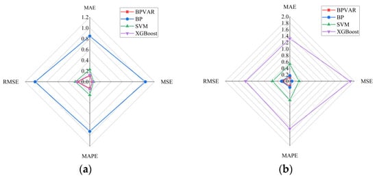 Radar diagram of prediction errors for the seventh type of surveying point. (a) UP22 measuring point prediction error radar chart; (b) UP24 measuring point prediction error radar chart.