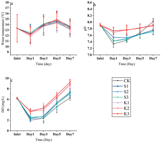 Temporal variations of water temperature (a), pH (b), and DO (c) in mixed addition of biochar treatment group (K1, K2, and K3), with rhizosphere addition of biochar treatment group (S1, S2, and S3), and without biochar (CK).
