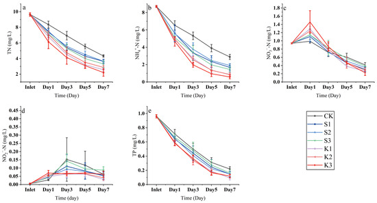 Temporal variations of TN (a), NO3−-N (b), NH4+-N (c), NO2−-N (d), and TP (e) in mixed addition of biochar treatment group (K1, K2, and K3), with rhizosphere addition of biochar treatment group (S1, S2, and S3), and without biochar (CK).