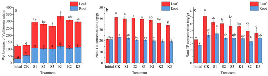 Wet biomass (a), nitrogen (b), and phosphorus (c) concentrations of plant tissue in mixed addition of biochar treatment group (K1, K2, and K3), with rhizosphere addition of biochar treatment group (S1, S2, and S3), and without biochar (CK). Different lowcase letters indicates significant differences (p < 0.05).