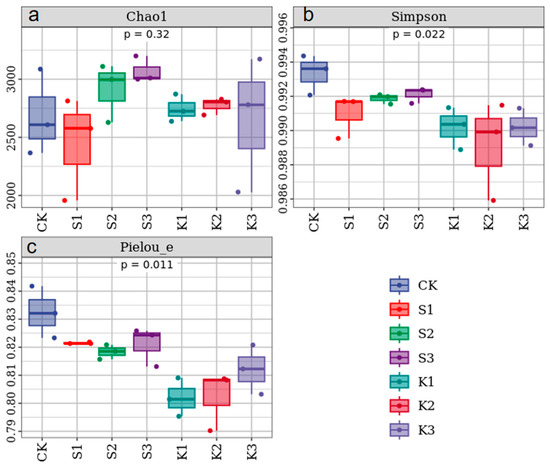 The petal plot more visually counts the number of OTUs shared and unique to each sample to understand their compositional similarity and overlap (Figure S4). The number of detected OTUs ranges from 1752 (K1) to 2425 (S3), with 989 shared OTUs, where the number of OTUs in K1, K2, and K3 are smaller than the corresponding S1, S2, and S3 with CK. Figure 4 showed that the chao1 indices of the seven sediment samples were not significantly different; however, the values of the Simpson index and Pielou index of sediment samples in K1, K2, and K3 were significantly smaller than those of S1, S2, S3, and CK (p < 0.05). The Simpson index combines species richness and diversity, with larger values indicating higher species diversity. The Pielou index indicates homogeneity, with larger values indicating greater homogeneity [49].
