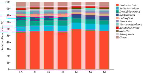 In view of the fact that the microbial diversity of sediments in K1, K2, and K3 were smaller than that of S1, S2, S3, and CK, the addition of biochar reduced the diversity of microbial communities and the mixed addition approach suppressed microbial communities more significantly than the rhizosphere addition. In contrast with this study, it has been found that biochar increased the abundance of microbial communities [26,50]. The effect of biochar on sediment microbial abundance and community structure was complex and depended mainly on the physicochemical properties of biochar and the sediment physicochemical properties, as well as sediment enzyme activities, so further research is needed to investigate the interaction mechanism between biochar and micro-organisms.