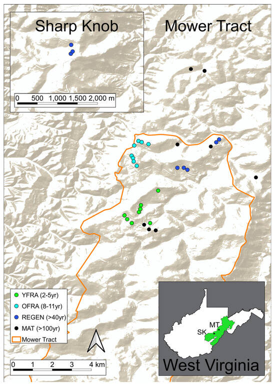 Locations of wetlands (n = 32) surveyed for amphibians in the Monongahela National Forest (West Virginia USA). Larger map shows sites located in the Mower Tract (MT; Randolph County) the inset map shows sites located at Sharp Knob (SK; Pocahontas County). Wetland attributes were collected and amphibian surveys were conducted in 32 sites, including eight sites recently restored using the Forestry Reclamation Approach (i.e., YFRA; 2–5 years old), eight older FRA (OFRA) sites (8–11 years old), eight wetlands in naturally regenerated (REGEN) minelands (>40 years old), and eight natural wetlands in unmined, mature (MAT) forest sites.
