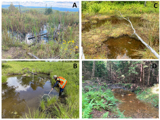 We selected wetlands within four treatment categories: younger FRA (YFRA) sites (2–5 years post-reclamation), older FRA (OFRA) sites (8–11 years post-reclamation), naturally regenerated (REGEN) sites (>40 years since mining) that were originally reclaimed as grasslands that were left to undergo natural forest succession, and unmined, mature (MAT) sites (Figure 2). YFRA sites were replanted with a mix of red spruce and native hardwoods between 2017 and 2020. Planted trees averaged < 1 m in height during data collection in 2022. Herbaceous species, including swamp milkweed (Asclepias incarnata) and boneset (Eupatorium perfoliatum), were planted around the constructed wetlands. OFRA sites were replanted with red spruce, aspen (Populus spp.), serviceberry (Amelanchier arborea), and black cherry (Prunus serotina) from 2011–2014. At the time of surveying in 2022, most of these planted seedlings were between 2–4 m high. We considered both YFRA and OFRA to be young successional forest as herbaceous plant cover was extensive both around the wetlands and within the surrounding uplands. All wetlands in FRA treatments were constructed during the site preparation (i.e., soil decompaction) and were created using a mid-sized excavator to create a depression in areas with clay or wet soils. Small berms surrounded created wetlands to promote inundation, and downed trees, other woody debris, and large rocks were placed in wetlands as habitat features. Woody debris was loaded in the terrestrial areas around wetlands. Naturally regenerated sites (REGEN) were mined prior to the Surface Mining Control and Reclamation Act of 1977 (SMCRA) and initially reclaimed as grasslands. These sites were located on coal mine benches between steep highwalls on flat, narrow strips of land with native forest adjacent to mined areas. The compacted soils at REGEN sites limited the growth of native trees, resulting in extensive herbaceous ground cover [19]. Non-native conifers (e.g., Norway spruce (Picea abies)) were planted at a few of the sites after initial grassland reclamation, resulting in partial or complete canopy closure over wetlands. Finally, MAT sites were wetlands within mature, second growth red spruce-northern hardwood forest that were not impacted by coal surface mining. Red spruce, yellow birch (Betula alleghaniensis), red maple (Acer rubrum), and beech (Fagus grandifolia) were the dominant tree species at the MAT sites.
