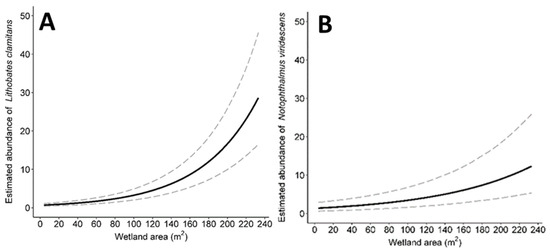 The covariate with the most consistent influence on species occupancy and abundance was wetland area. Wetland area had a positive effect on Green Frog occupancy and abundance and Wood Frog and Eastern Newt abundance. Previous studies have also highlighted the relationship between larger wetlands and increased occupancy rates and abundance [13,50,51]. Specifically, seasonal wetlands that range from 1000–10,000 m2 support the greatest number of species [51,52], because the larger wetland size leads to decreased inter-and intra-species competition and overall stress [53]. The wetlands at our study site ranged from 4.7 m2 to 233.2 m2, suggesting that creating larger seasonal wetlands during restoration activities may promote higher occupancy rates and greater amphibian abundances.