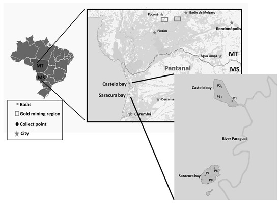 The Paraguay River is 2695 km long; its watercourse runs from the state of Mato Grosso (Brazil) and passes through the countries of Paraguay and Bolivia to the state of Mato Grosso do Sul (Brazil). It is a tributary of the Paraná River in Argentina. Besides its tributaries, there are several lakes and bays connected to the Paraguay River, which depending on the flood pulse can significantly change the physical, chemical, and biological characteristics of the river, such as increasing or decreasing the transparency of river water, its hydrogen potential, electrical conductivity, the concentration of dissolved gases, among other elements [1]. Another specific characteristic of the Pantanal bays that negatively affects the Paraguay River is the “dequada” phenomenon, which occurs only in wetlands. Besides increasing the concentration of organic matter, thus decreasing the concentration of oxygen available in the water, this phenomenon can also potentiate mercury methylation in the aquatic system of Pantanal [5,6,8,14].