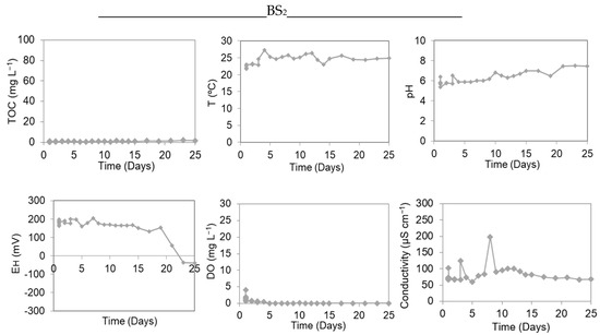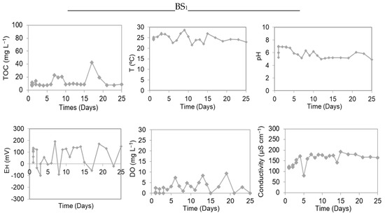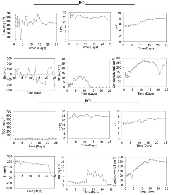 The temperature varied between 21.80 °C and 29.99 °C for BC1 and 21.63 °C and 26.76 °C for BC2, and these values do not represent an orderly beginning and end. The temperature affects methylation and microbial activity. Some studies show higher methylation in the summer, with higher temperatures [29,30]. The average conductivity was 175.8 μS cm−1 for BC1 and 179 μS cm−1 for BC2, over 25 days. Ionic compounds are conductors of electricity, whether solubilized in an aqueous, liquid, or pure medium. The ions allow mobility in the solution and can be easily attracted to the electrode.