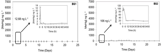 Analyzing the results of Figure 5, it should be noted that, at the time of methylation, both BS1 and BS2 experiments showed pH values ranging from 5.0 to 5.5. As discussed previously, acidic pH in a favorable environment can favor the Hg methylation process. Studies show that only the acidic pH cannot regulate the formation of MeHg and, depending on the environment, Hg2+ bonds with free sulfide may occur, decreasing Hg methylation [8,28,29].