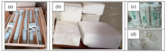 Gypsum rocks and samples: (a) core samples taken from boreholes, (b) blocks of surface rocks, (c) core samples for testing, and (d) residual fragments.