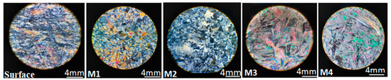 To analyze the petrology of the rock samples, two techniques were employed, involving microscopic study (thin sections) and x-ray diffraction (XRD). Figure 3 depicts the microscopic analysis of the samples using a polarizing microscope. Gypsum and anhydrite were the predominant components of the rock samples, and their distinction was easily discernible by rotating the microscope stage, revealing their differences in birefringence. Anhydrite exhibited a higher birefringence. Additionally, it was observed that the texture of the surface sample was microcrystalline.