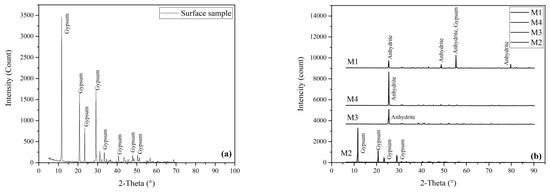 Figure 4 illustrates the XRD analysis of the samples. The surface specimens and M2 consist of pure gypsum, whereas the M3 and M4 samples were identified as anhydrite rocks. The M1 sample is composed of a mixture of gypsum and anhydrite.