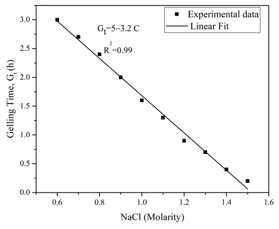 Figure 5 illustrates the relationship between the gelling time and the molarity of the NaCl solution. To determine the gelling time of colloidal silica with NaCl, the gel flowability and needle insertion technique proposed by Shen et al. [38] was employed. In this method, the NaCl solution was added to the colloidal silica at 22 °C and the mixture was stirred in an automatic mixer for 3 min. The gelling time was defined as the point at which the grout no longer flowed when tilted and a needle could stand in the gel without any external support.