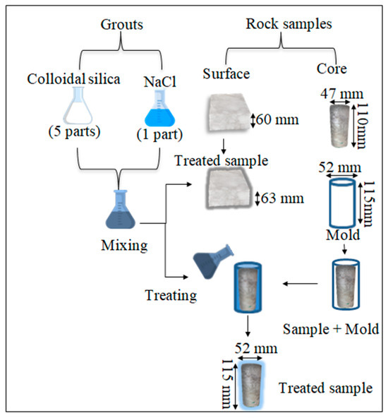 Each core sample was initially placed at the center of a cylindrical mold with a diameter and height 5 mm larger than those of the rock sample. To obtain a uniform gap between the sample and the mold, a cylindrical mold with an internal diameter of 48 mm and 4 mm thickness (external diameter was 52 mm) was inserted between the sample and the mold and then carefully removed before pouring the silica solution. The silica solution was then poured into the space between the mold wall and the rock sample, covering the sample with a uniform thickness of 2.5 mm. After 50 min, the treated core sample was extracted from the mold and immersed in distilled water for curing periods of 1, 7, and 21 days.