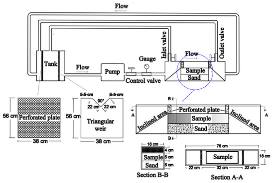 The Plexiglas container was the test place of the sample. To minimize turbulence in the circulated water, the container inlet and outlet were inclined and perforated plates were placed on both. The container has a Plexiglas cover which is closed through three steel frames. This cover was equipped with two inlet and outlet valves for air bubble removal during the tests. To maintain stable temperatures throughout the test, the pump was separated from the electromotor. There is a perforated plate in the tank that prevents air bubbles during water circulation in the system. In this apparatus, the flow rate was measured using the V-notch method [39].