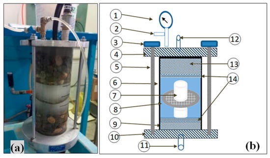 Figure 8 illustrates the pressure-based dissolution test apparatus, consisting primarily of a Plexiglas cylinder cell with a height of 30 cm and an internal diameter of 11 cm. There are two steel benches at either end of this cylinder cell, interconnected through three steel clamps and screws. Both benches incorporate inlet and outlet ports to enable the circulation of water. Additionally, an air vent was linked to the upper bench to facilitate the removal of air bubbles. Moreover, this cell features a pressure gauge for continuous monitoring of the pressure throughout the test. A pump and a tank with a storage capacity of 250 L were used to circulate water at a pressure of 400 kPa through this cell.