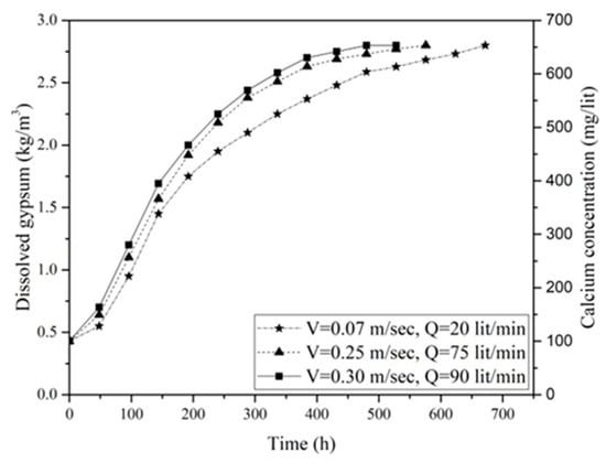 Figure 9 shows the variation of gypsum concentration over time for untreated surface samples under different flow velocities (V) and different discharges (Q). It can be seen that the higher flow velocities consistently correlated with increased dissolution rates across all samples. This acceleration in dissolution rate is accompanied by a reduction in the time needed to reach a saturated concentration (Cs), indicating the point at which the water lost its ability to dissolve further CaSO4. Specifically, at a water flow velocity of 0.07 m/s, the equilibrium was achieved after 672 h (h), which decreased to 528 h and 432 h at flow velocities of 0.25 m/s and 0.3 m/s, indicating a 21.5% and 35.7% reduction in saturation time, respectively.