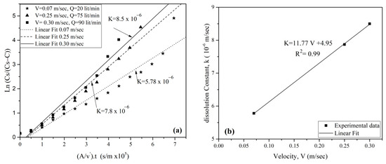 Using Equation (5), the dissolution rate coefficient (K) was derived from the relationship and in all three tests of the untreated surface samples, as illustrated in Figure 10a. The correlation of corresponding K values with various flow velocities (V) were then graphically represented in Figure 10b. Notably, the dissolution rate exhibited a significant sensitivity and proportional increase with flow velocity (V) and maintained an average correlation coefficient of approximately 1.00. These findings align consistently with the results reported by James and Lupton [35].