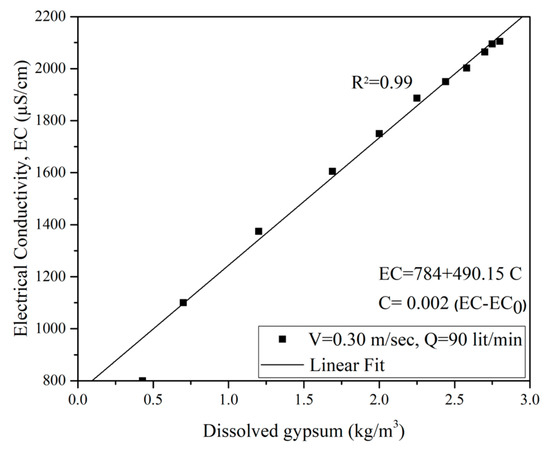 Figure 11 illustrates the relationship between calcium (gypsum) concentration and electrical conductivity for the untreated sample tested under 0.3 m/s water flow. The measured values are in the range of 800 μS/cm to 2150 μS/cm. A slight change in the EC value is attributed to the presence of other ions.
