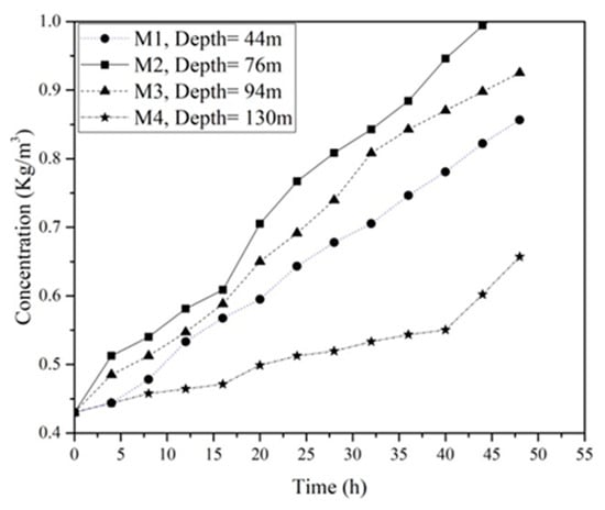 Figure 12 represents the variation of gypsum concentration with time for reference borehole core samples (M1to M4). It can be observed that M2 exhibits the highest dissolution rate, while M4 demonstrates the lowest value of dissolution rate during 48 h of the test. This distinction can be attributed to variations in the chemical composition of the samples.