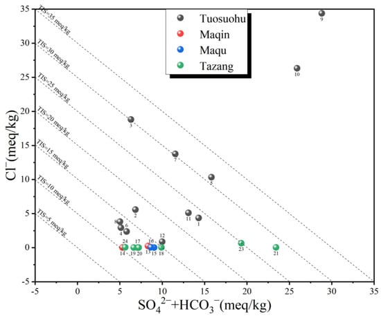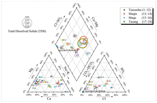 The Ca/Mg values in the research region ranged from 0.25 to 12.67, with an average of 3.71. A Ca/Mg value greater than 1 indicates the high solubility of groundwater in limestone. The Na/K values in the Tuosuohu segment ranged from 8.85 to 52.86, with an average of 29.66, while the Na/Ca values in the same segment ranged from 0.65 to 8.81, with an average of 2.99. In the Maqin, Maqu, and Tazang segments, the Na/K values ranged from 2.87 to 14.84, with an average of 6.707, and the Na/Ca ratios varied between 0.05 and 0.42, with an average of 0.13. The relatively low values of Na/K and Na/Ca, with higher values in the northwestern mountainous area compared to the southeastern section, may suggest that the spring water originates from a descent spring fed by an aquifer in front of a mountain in the Maqin, Maqu, and Tazang regions [42]. The diversity in the level of total ionic salinity (TIS) was noticeable in the spring samples, as evident from the correlation plot of SO42− + HCO3− vs. Cl− (see Figure 3). The majority of the spring waters analyzed had TIS values below 30 meq/kg. The comprehensive analysis of the major elements indicated that the springs possess complex water compositions (see Table 1).