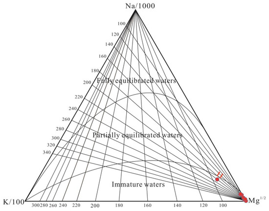 To assess the balance of water–rock reactions, a Na–K–Mg triangle diagram was employed (see Figure 4) [43]. In this study, all the samples were located along the Mg1/2 endmember, indicating an insufficient reaction between the groundwater and the surrounding rock. This observation supports the hypothesis that the fracture connectivity is strong and the water circulation speed is fast, leading to insufficient water–rock reactions and the mixing of the thermal groundwater with cold water during its ascent. Hot spring No. 11 is closer to partially balanced water, which can be attributed to its location near the fault intersection zone (ELSF and KZF), where the fault is deeper, resulting in a longer water–rock reaction time and a higher dissolution of rock components into the water.