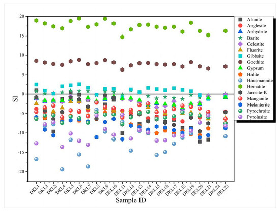 The mineral saturation index (SI) of the thermal springs provides insights into the thermodynamic behavior of minerals and the equilibrium process between the water and rock. This index helps to predict the mineral types deposited during water circulation. Typically, an SI value ranging from 0 to 0.2 indicates that a mineral is in an equilibrium state. A positive SI value indicates supersaturation, while a negative SI value suggests the continued dissolution of the mineral. In this study, the mineral saturation index (SI) was determined using PHREEQC software 2.12.5 (see Figure 5). It is evident that all of the spring water samples exhibited supersaturation (SI > 0) with respect to hematite and goethite. This indicates that these minerals are abundant in the water and continuously precipitate as hot water rises. On the other hand, gibbsite and fluorite exhibited equilibrium conditions (SI ≈ 0). Most of the other minerals were in an unsaturated state (SI < 0). This can be attributed to the low mineral content, the short reaction time between the water and rock, and the inherent characteristics of the minerals themselves. The saturation index with respect to hausmannite and pyrolusite showed significant variation among the spring water samples, reflecting differences in the distribution characteristics of the surrounding rocks to some extent.
