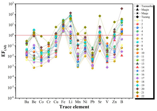 Trace element content is generally influenced by lithology, water alkalinity, and human activities. It may also function as a gauge for assessing the extent of water–rock interaction. Different elements have different implications. In our study, we measured 26 trace elements, including Be, Ag, Cd, Al, Ba, Fe, Co, Cr, Cu, Li, Mo, Mn, Pb, Ni, Sr, Sb, Sn, Th, Ti, Tl, U, V, B, and Zn (see Table 2). It was evident that the content of the same element may vary significantly across different springs. To quantitatively evaluate the trace elements, we employed the enrichment factor (EF). The EF is an important index that quantifies the degree of enrichment of elements. Higher EF values indicate higher degrees of enrichment. The formula for EF calculation is as follows: