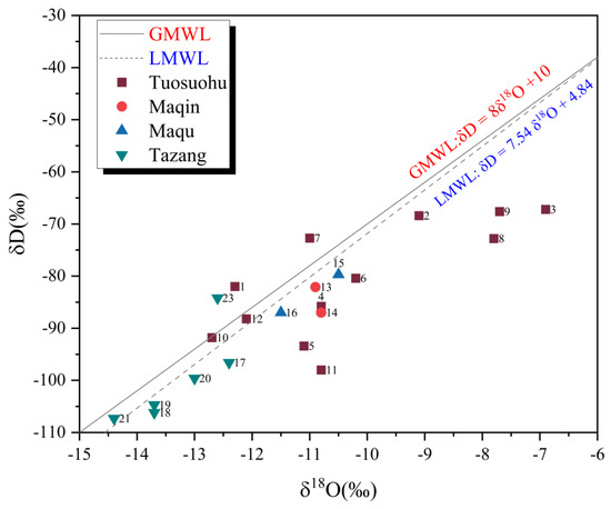 Graph of the relationship between δD and δ18O. GMWL: δD = 8δ18O + 10 [61]; LMWL: δD = 7.54 δ18O + 4.84 [62].